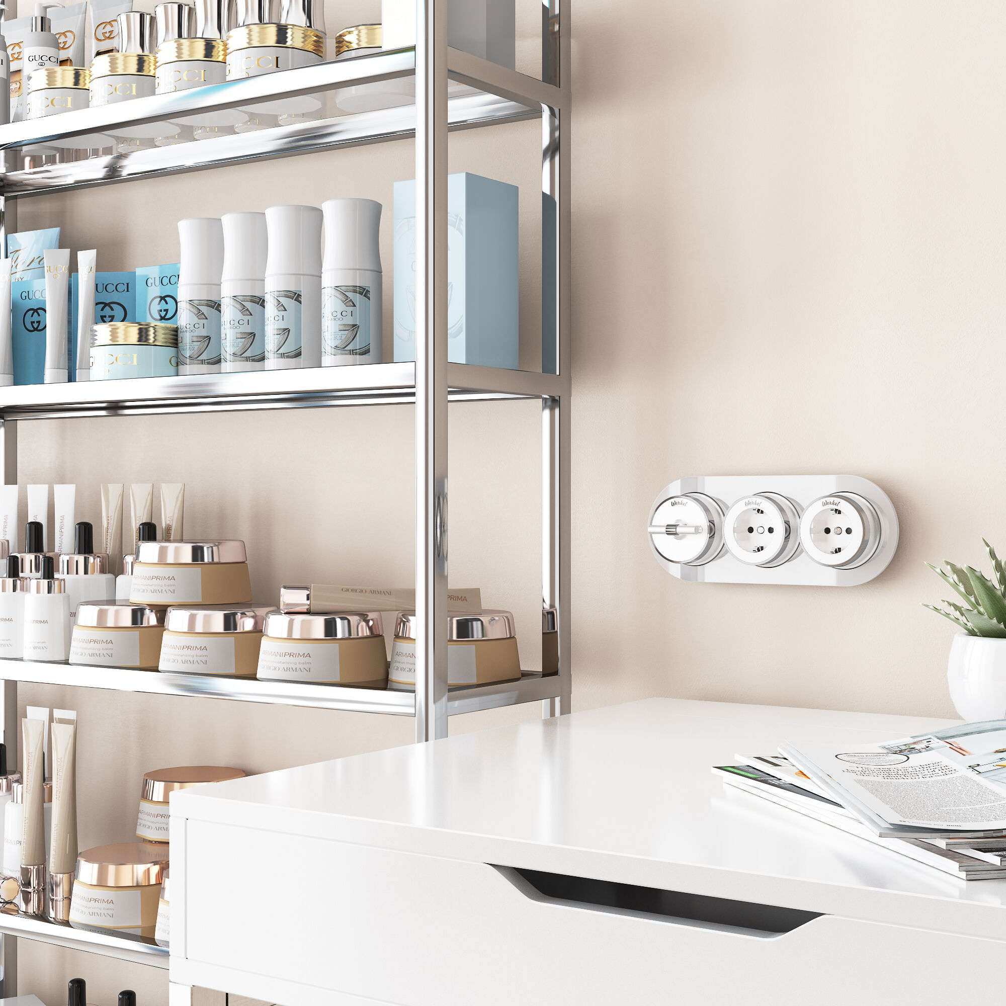 Дополнить образ помогут рамки Werkel из металла, стекла, и дерева, а так же аксессуары для накладного монтажа проводки.