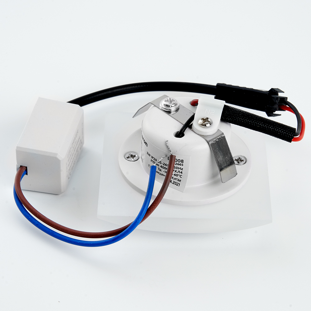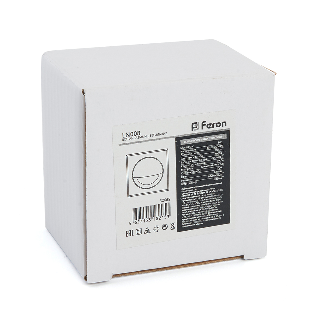 Светильник встраиваемый светодиодный, для лестничной подсветки (ДВО) FERON LN008, 3W 4000К (белый), 85-265V, 210Lm, IP20, цвет белый, корпус алюминий, рассеиватель акриловый полимер, 60*60*33 мм, монтажн.отв. 40 мм.