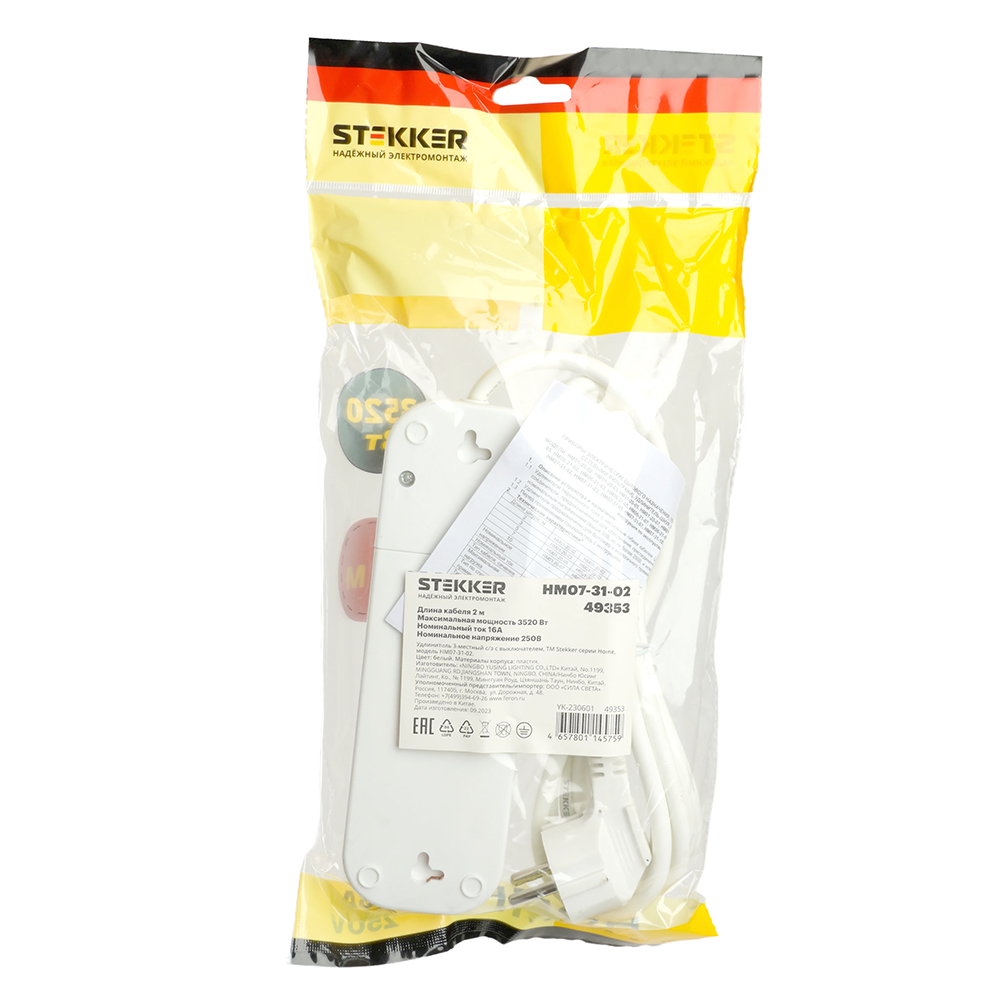 Удлинители STEKKER 49353, серия Home, цвет белый, длина 2 м, количество розеток 3, сталь, сечение кабеля 1 мм2, тип кабеля ПВС, материал кабеля -, ток 16А, напряжение 250В, максимальная нагрузка 3520Вт, тип вилки - прямая. Диапазон рабочих температур +1..+35°C, степень защиты IP20, класс защиты от поражения эл. током 1, размеры изделия -*-*-. Гарантия 1 год.
