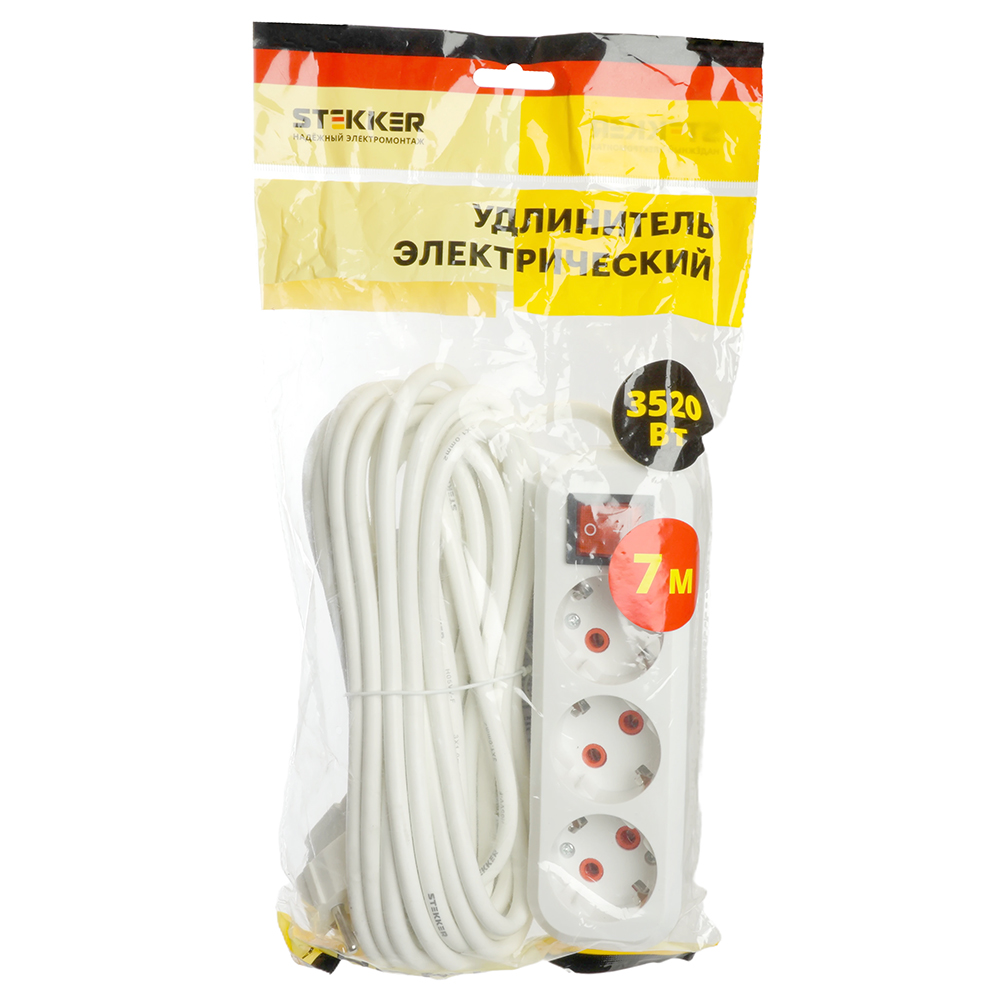 Удлинители STEKKER 49356, серия Home, цвет белый, длина 7 м, количество розеток 3, сталь, сечение кабеля 1 мм2, тип кабеля ПВС, материал кабеля -, ток 16А, напряжение 250В, максимальная нагрузка 3520Вт, тип вилки - прямая. Диапазон рабочих температур +1..+35°C, степень защиты IP20, класс защиты от поражения эл. током 1, размеры изделия -*-*-. Гарантия 1 год.