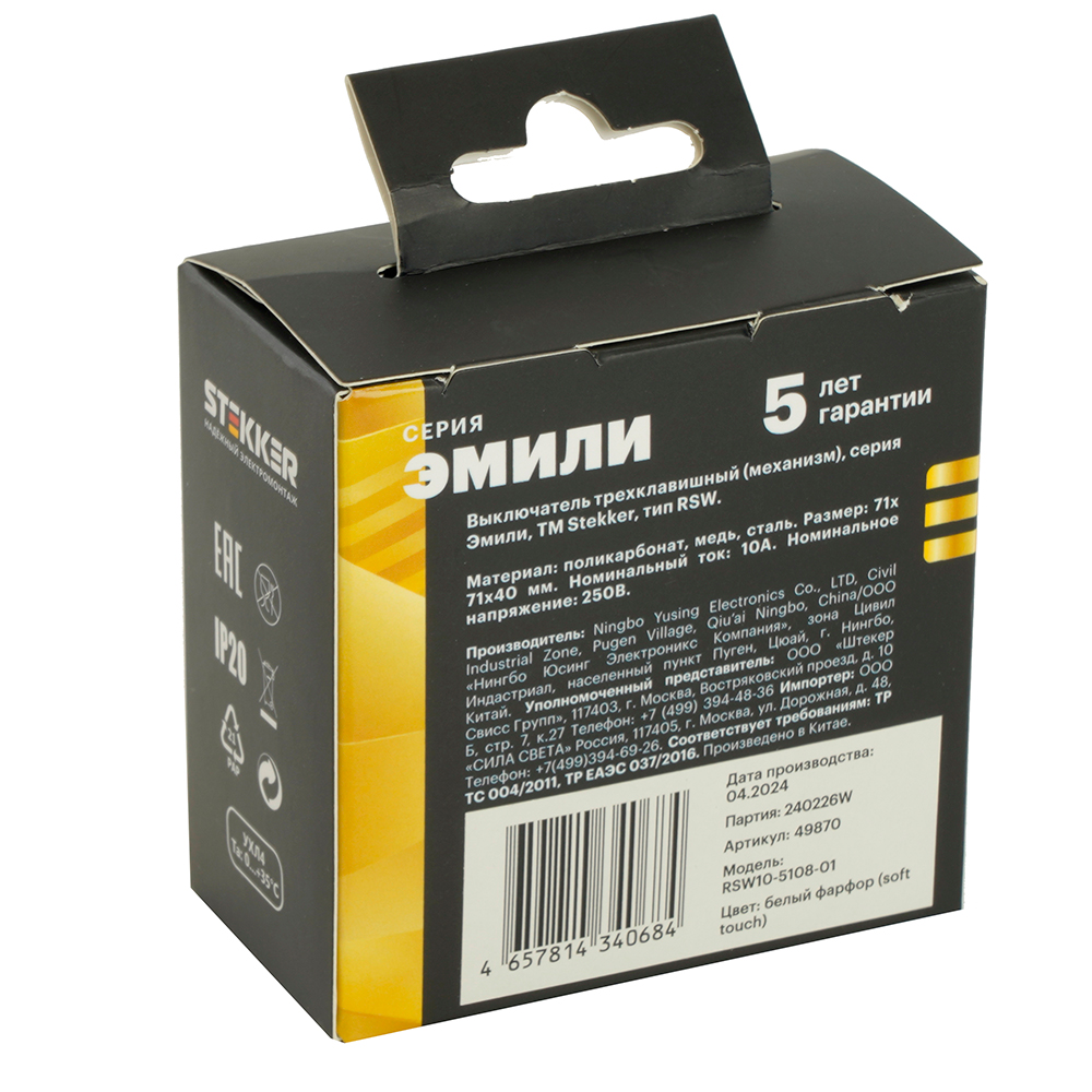 Выключатели трехклавишный STEKKER RSW10-5108-01, серия Эмили тип установки - скрытый, размер изделия 71*71*40мм., цвет белый фарфор, soft touch, материал изделия поликарбонат, латунь, сталь. Номинальное напряжение 250 , номинальный ток 10А, 20